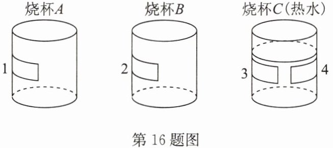 16. 小明准备3个相同的空烧杯A、B、C,在烧杯C中倒入适量的热水,小华找来4张相同的餐巾纸,把其中一张纸对折后撕去一半,分别标记为1、2、3、4,并把它们喷同样多的水,然后将4张湿纸分别贴在烧杯的外壁,如图所示.