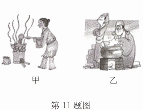 11. 如图甲、乙是“扬汤止沸”和“釜底抽薪”的两幅漫画. “扬汤止沸”是指把锅里沸腾的水舀起来再倒回去,他是通过______(选填“升高”或“降低”)水的温度的方式止沸的;“釜底抽薪”是指从锅下抽掉燃烧着的柴薪,他是通过停止给水加热,让水不能继续______的方式止沸的.