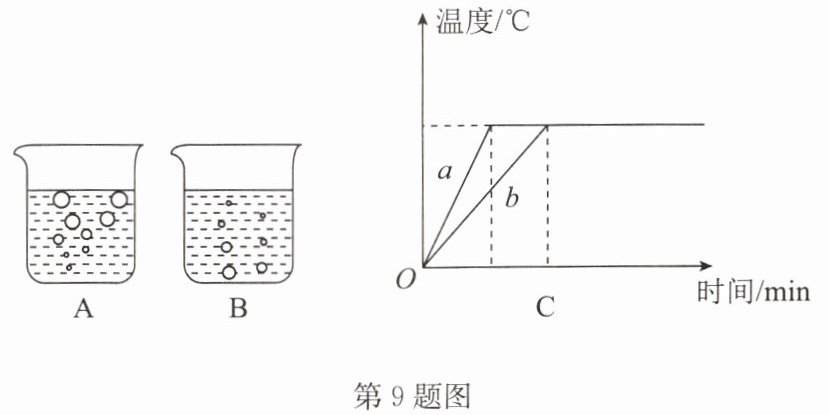 9. 甲、乙两组同学正在进行“探究水的沸腾”实验. 当水沸腾时,烧杯中产生大量气泡,沸腾时的情景如图______(选填“A”或“B”)所示;两小组绘制了水沸腾时的温度—时间图像,得到了a、b两种不同图像(如图C所示),其原因是______;有同学建议实验时在烧杯上放置一个纸板,其目的是______.