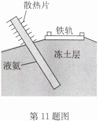 11. (2024·东台期末)为保证青藏铁路冻土区路基的稳定性,铁路两侧安装了许多封闭的中空热棒,内部填充非常容易汽化的液态氨.如图所示,热棒下端插在冻土中,利用氨的物态变化给冻土降温,把冻土中的热量“搬运到”热棒上端,通过散热片向空中放热,从而使冻土保持稳定.氨在热棒的上端和下端发生的物态变化是( )