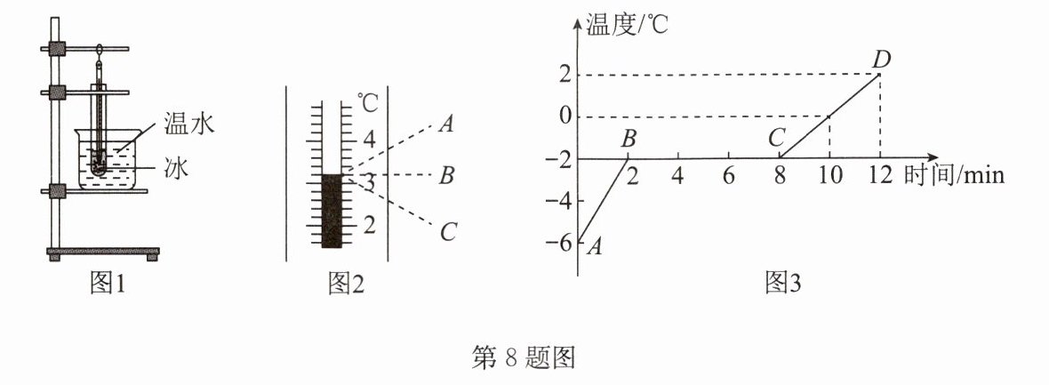 (3)实验中,他所测得的温度值比真实值要高,则他可能是按图2中的______(选填“A”“B”或“C”)方法进行读数的。