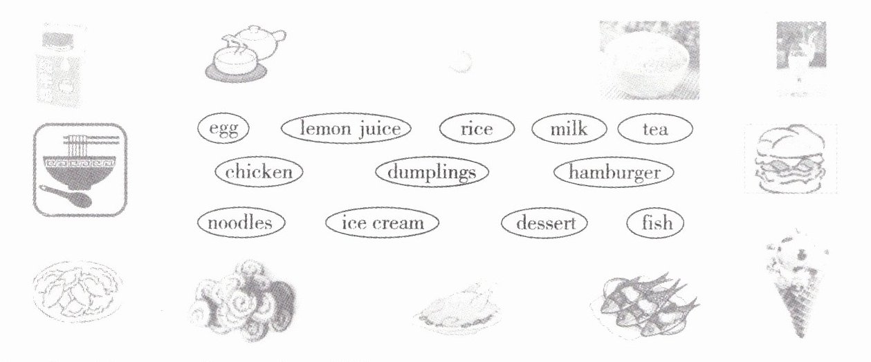 将框中表示食品或饮料名称的单词与对应的图片连线。你能写出更多的食品名称吗?