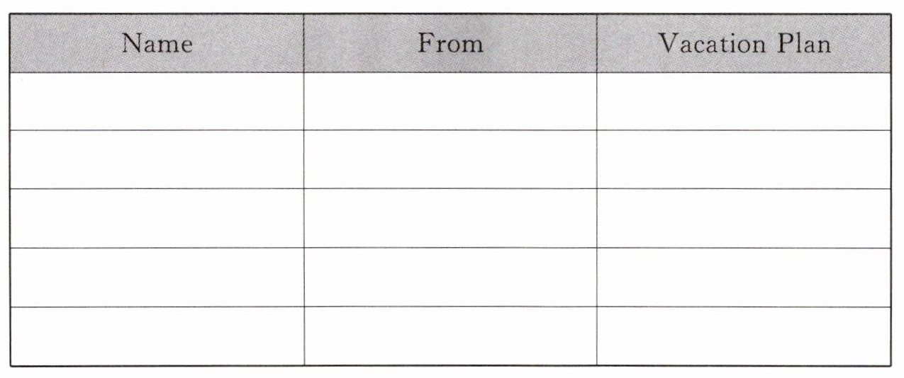 | Li Lei | City | He plans to take some art classes, visit museums, and go on a short trip with his parents. |