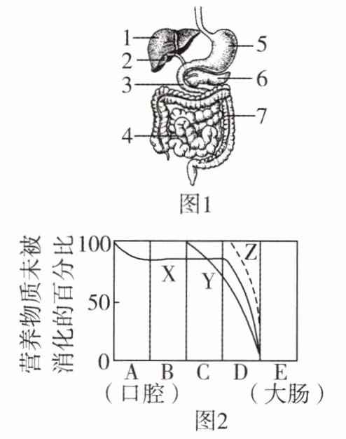 12. 图1为人体消化系统部分结构示意图,图2为淀粉、蛋白质、脂肪在消化道中各部位被消化的程度,请据图回答下列问题。
