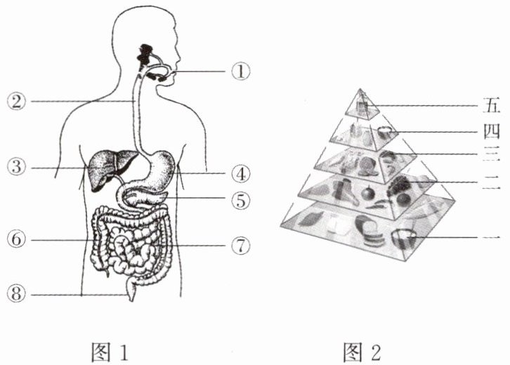 9. 随着生活水平的日益提高,人们在关注美食的味道的同时,对食品安全和健康饮食也提出了更高的要求。图 1 为人体消化系统示意图,图 2 为“平衡膳食宝塔”示意图。据图回答下列问题。