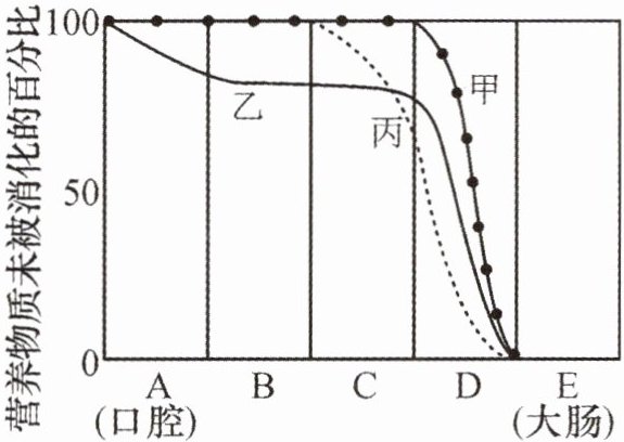 7. 如图,甲、乙、丙曲线分别表示三类营养物质在人体消化道中各部位(依次用 A、B、C、D、E 表示)被消化的程度。下列分析正确的是 (