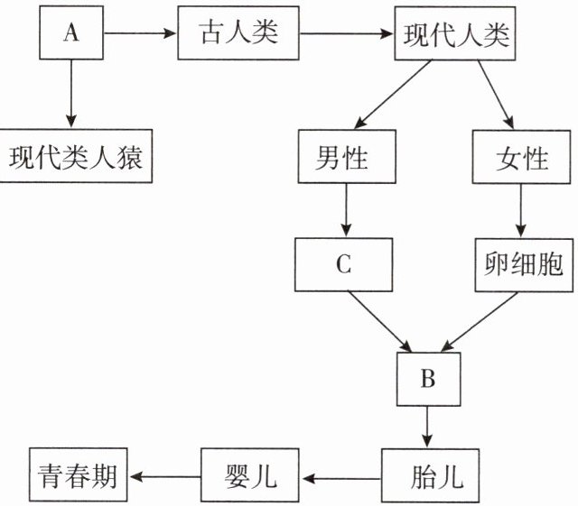 10. 下图为人类起源与生殖发育概念图,请据图回答下列问题。