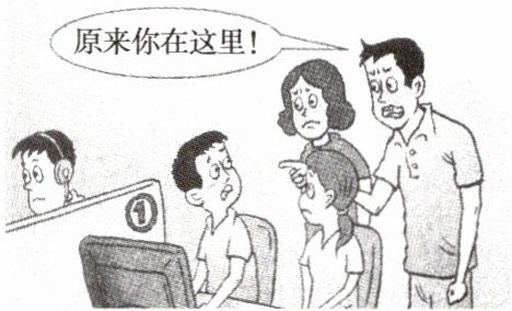 ①漫画中的孩子缺乏法律意识,没有依法自律 ②网吧经营者违反了社会保护的相关规定 ③家长找孩子的行为违背了家庭保护的要求 ④青少年上网是自己的事,与他人无关