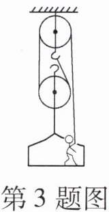 3. 如图,体重500N的人站在吊篮中,吊篮重力$ G = 700N $。要将吊篮匀速吊起,不计滑轮、绳重及摩擦,人至少要用