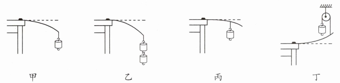 如图所示,将一个弹性较好的钢片固定在桌边,在钢片上用细线挂钩码,使钢片受力而发生如图甲、乙、丙、丁的四种形变: