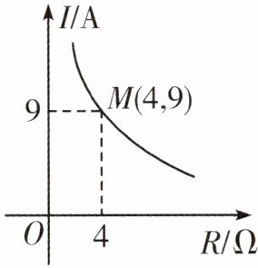 2. 蓄电池的电压为定值,使用此电源时,电流 $ I ( \mathrm { A } ) $ 是电阻 $ R ( \Omega ) $ 的反比例函数,其图象如图所示.