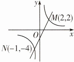 2. 已知一次函数$y = ax + b$的图象与反比例函数$y = \frac{k}{x}$的图象交于$M(2,2)$,$N(- 1,- 4)$两点,如图所示,根据图象写出反比例函数的值小于一次函数值时的$x$的取值范围