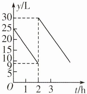 1. 张师傅驾车从甲地到乙地,两地相距 500 km,汽车出发前油箱有油 25 L,途中加油若干升,加油前、后汽车都以 100 km/h 的速度匀速行驶,已知油箱中剩余油量 $ y(\text{L}) $ 与行驶时间 $ t(\text{h}) $ 之间的关系如图所示,以下说法错误的是(