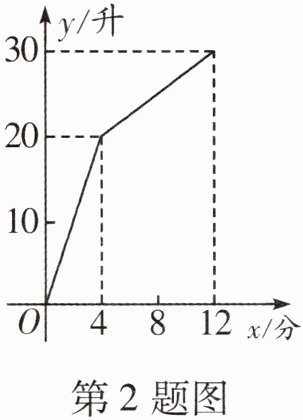 2. 一个装有进水管和出水管的容器,从某时刻开始的 4 分钟内只进水不出水,在随后的 8 分钟内既进水又出水,接着关闭进水管直到容器内的水放完. 假设每分钟的进水量和出水量是两个常数,容器内的水量 $ y $(升)与时间 $ x $(分)之间的部分关系如图所示. 那么,从关闭进水管起
