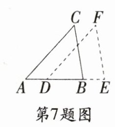 7. 如上页图,三角形ABC沿直线AB方向平移后得到三角形DEF。若$AE= 11$,$DB= 5$,则平移的距离是