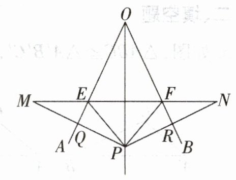 11. 如图,已知点P在$∠AOB$的内部,且点P与点M关于OA对称,PM交OA于点Q,点P与点N关于OB对称,PN交OB于点R,MN分别交OA,OB于点E,F,连结PE,PF。