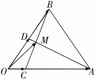 11. 如图所示,在$\triangle OAB$中,$\overrightarrow{OC}= \frac{1}{4}\overrightarrow{OA}$,$\overrightarrow{OD}= \frac{1}{2}\overrightarrow{OB}$,$AD与BC交于点M$,设$\overrightarrow{OA}= \boldsymbol{a}$,$\overrightarrow{OB}= \boldsymbol{b}$,试以$\boldsymbol{a},\boldsymbol{b}为基底表示\overrightarrow{OM}$。