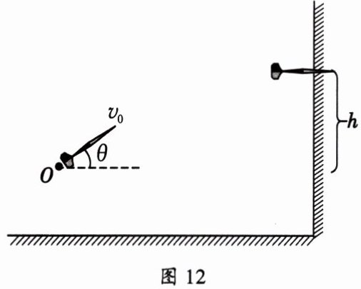 16. (10分)如图12所示,将一支“飞镖”斜向上抛出后垂直扎在竖直木板上(逆过程为平抛运动),测得初速度$v_0与水平方向的夹角\theta = 30^{\circ}$,飞镖上升高度$h = 1.25$m,g取10m/s^2,求:(1)飞行时间t;(2)“飞镖”抛出的初速度$v_0$。
