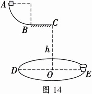 18. (15分)如图14所示,一半径R= 0.8m的圆盘水平放置,在其边缘E点固定一小桶(可视为质点),在圆盘直径DE的正上方平行放置一水平滑道BC,已知滑块与滑道BC间的动摩擦因数$\mu = 0.5$。滑道右端C点与圆盘圆心O在同一竖直线上,且竖直高度h= 0.8m。AB为一竖直面内的光滑圆弧轨道,半径r= 0.45m,且与水平滑道相切于B点。一质量m= 0.2kg的滑块(可视为质点)从A点由静止释放,当滑块经过B点时对B点压力为6N。物块滑过BC段后由C点水平抛出,此时圆盘从图示位置以一定的角速度$\omega$绕通过圆心的竖直轴匀速转动,最终物块恰好落入圆盘边缘的小桶内,若取g= 10m/s^2,求: