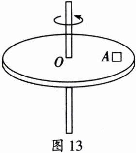 17. (12分)如图13所示,把质量为0.6kg的物体A放在水平转盘上,A的重心到转盘中心O点的距离为0.2m,若A与转盘间的最大静摩擦力为3N,g取10m/s^2,求: