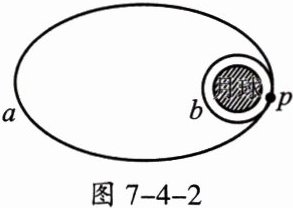 8. “嫦娥二号”卫星已成功发射,这次发射后卫星直接进入近地点高度200千米、远地点高度约38万千米的地月转移轨道奔月。当卫星到达月球附近的特定位置时,卫星就必须“急刹车”,也就是近月制动,以确保卫星既能被月球准确捕获,又不会撞上月球,并由此进入近月点100千米、周期12小时的椭圆轨道$a$。再经过两次轨道调整,进入100千米的近月圆轨道$b$。轨道$a$和$b$相切于$P$点,如图7-4-2所示。下列说法正确的是 (