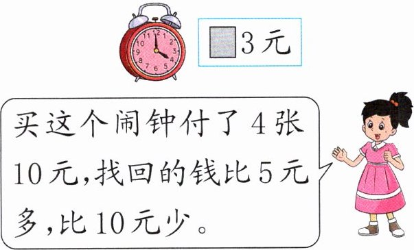 买这个闹钟付了4张10元,找回的钱比5元多,比10元少。