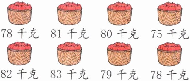 80×8=640(千克) 解析:每筐苹果都接近 80 千克,可以将每筐苹果看作 80 千克,有这样的 8 筐,则大约摘了 80×8=640(千克)苹果。