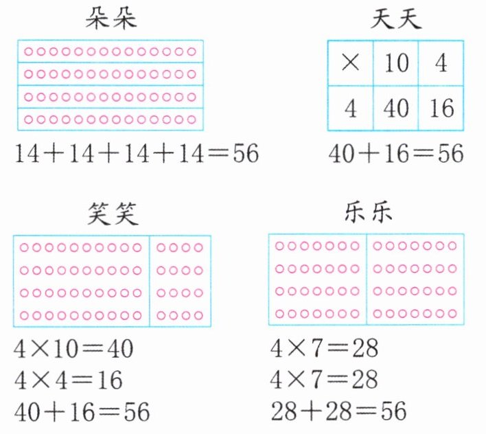 (1)下面是四名同学关于$14×4$的思考过程,其中合理的有( )个,和竖式计算算理相同的是( )和( )的思考过程。