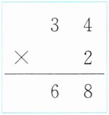 $\begin{array}{r} 34\\ ×\ \ 2\\ \hline 68\end{array} $
