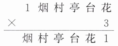 $\begin{array}{r} 1\ 烟\ 村\ 亭\ 台\ 花\\ ×\ \ \ \ \ \ \ \ \ \ 3\\ \hline 烟\ 村\ 亭\ 台\ 花\ 1\end{array} $