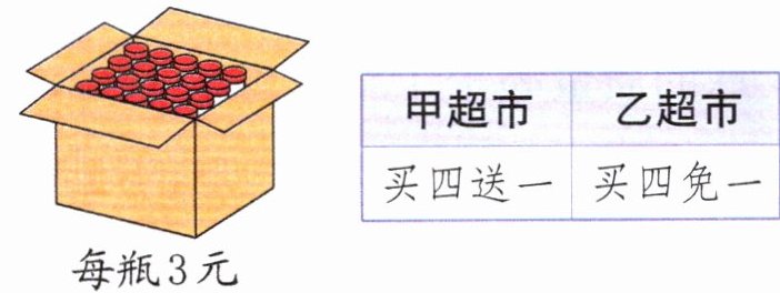 甲超市:20÷(4+1)=4(组) 4×4=16(瓶) 3×16=48(元) 乙超市:20÷4=5(组) (4-1)×5=15(瓶) 3×15=45(元) 48>45 去乙超市购买划算 解析:要知道去哪家超市购买划算,可以先把去两家超市购买分别需要的钱数算出来,再比较。去甲超市购买时,“买四送一”,也就是付 4 瓶的钱实际可以得到(4+1)瓶,把(4+1)瓶饮料看成 1 �组,那么 20 瓶里有 20÷(4+1)=4(组),每组有 4 瓶是需要付钱的,4 组就有 4×4=16(瓶)需要付钱,一共需要付 3×16=48(元);去乙超市购买时,“买四免一”,也就是付(4-1)瓶的钱实际可以得到 4 瓶,把 4 瓶饮料看成 1 组,那么 20 瓶里有 20÷4=5(组),每组有(4-1)瓶是需要付钱的,5 组就有(4-1)×5=15(瓶)需要付钱,一共需要付 3×15=45(元)。因为 48>45,所以去乙超市购买划算。