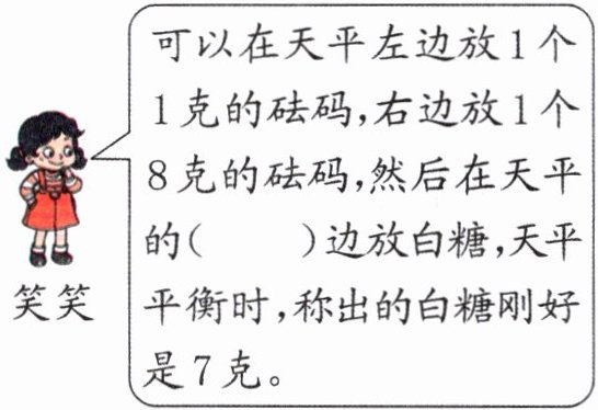 可以在天平左边放1个1克的砝码,右边放1个8克的砝码,然后在天平的( )边放白糖,天平平衡时,称出的白糖刚好是7克。