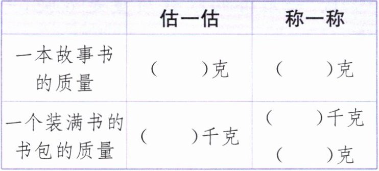 解析:本题可根据生活常识先对一本故事书和一个装满书的书包的质量进行估算,再通过实际称重得到准确质量。