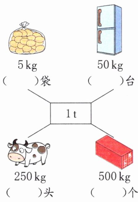 5kg ( )袋 50kg ( )台 1t 250kg ( )头 500kg ( )个