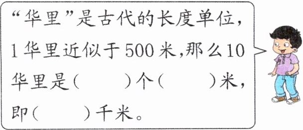“华里”是古代的长度单位,1华里近似于500米,那么10华里是( )个( )米,即( )千米。