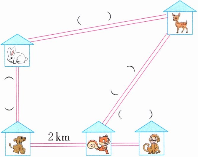 3. 如图所示为森林里小动物们的家的分布图。从小松鼠家到小狗家的路程大约是2 km,那么其他相邻两只小动物的家大约相距多远?估一估,填一填。