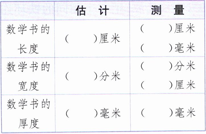 | 数学书的长度 | ( )厘米 | ( )厘米( )毫米 |