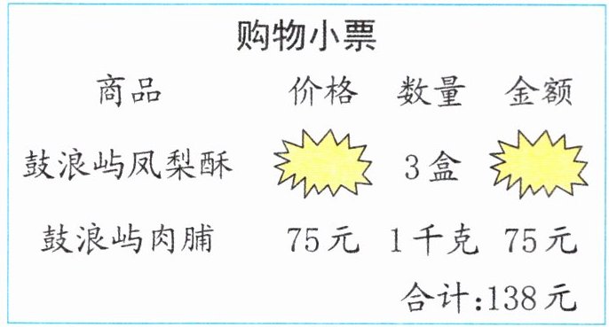5. 王阿姨和同事们一起去厦门游玩,她们去特产店购物,购物小票不小心弄上了污渍(如图),每盒鼓浪屿凤梨酥多少钱?