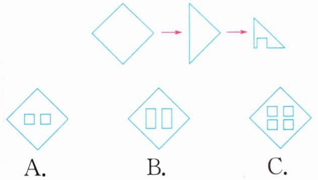(2)如图,把一张正方形纸对折两次,并剪去一个小正方形,打开后是( )。