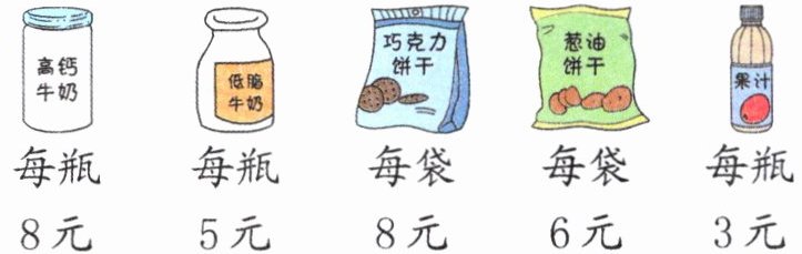 高钙牛奶 每瓶8元 低脂牛奶 每瓶5元 巧克力饼干 每袋8元 葱油饼干 每袋6元 果汁 每瓶3元