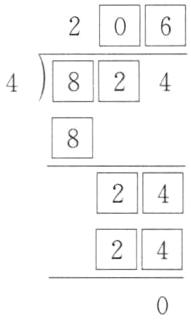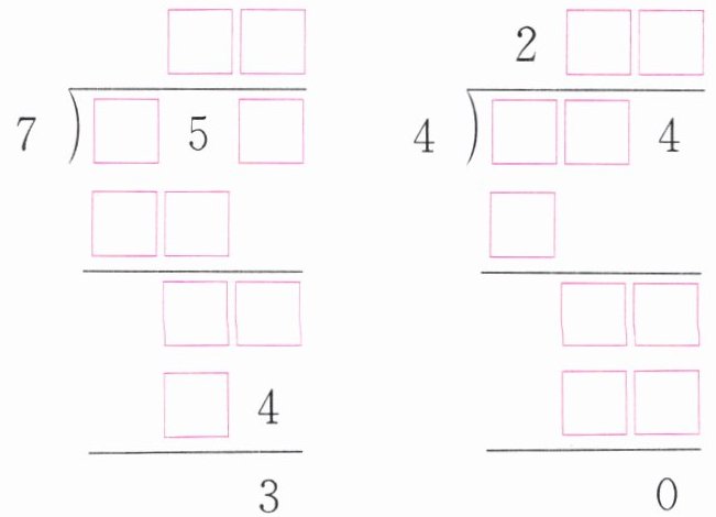 $\begin{array}{r} □□ \\ 7\enclose{longdiv} {□5□} \\ □□ \\ \hline □□ \\ □4 \\ \hline 3\end{array} $ $\begin{array}{r} 2□□ \\ 4\enclose{longdiv} {□□4} \\ □ \\ \hline □□ \\ □□ \\ \hline 0\end{array} $