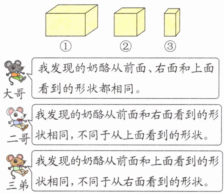 二哥:我发现的奶酪从前面和右面看到的形状相同,不同于从上面看到的形状。
