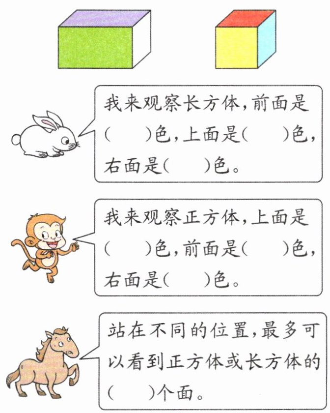 我来观察长方体,前面是( )色,上面是( )色,右面是( )色。
