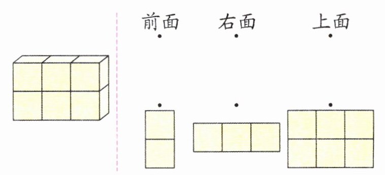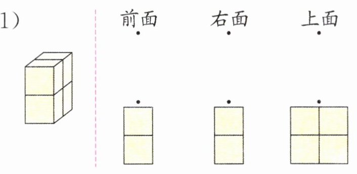 解析:先根据正方体的个数和从前面看到的图形确定拼成的长方体的形状,再画出从上面和右面看到的图形。