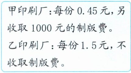 甲印刷厂:0.45×1000=450(元) 450+1000=1450(元) 乙印刷厂:1.5×1000=1500(元) 1450<1500 到甲印刷厂印刷合算