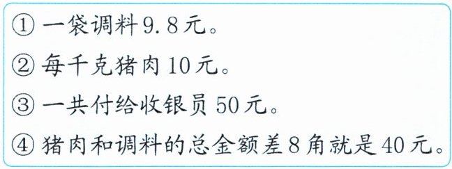 7. 妈妈在超市买了一块猪肉和一袋调料,但她记不清买了多少千克猪肉。请你根据下面的信息算一算,妈妈买了多少千克猪肉?