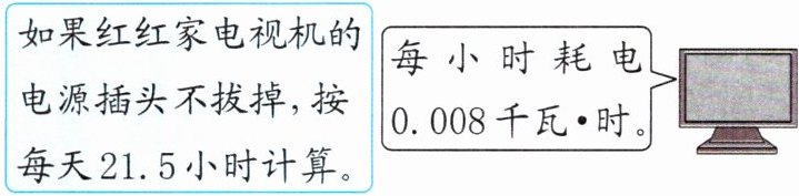 如果红红家电视机的电源插头不拔掉,按每天21.5小时计算。每小时耗电0.008千瓦·时。