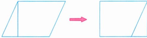1. 如图,把一个底是4厘米、高是3厘米的平行四边形割补成一个长方形,则长方形的长是( )厘米,宽是( )厘米,长方形的面积是( )平方厘米,平行四边形的面积是( )平方厘米。