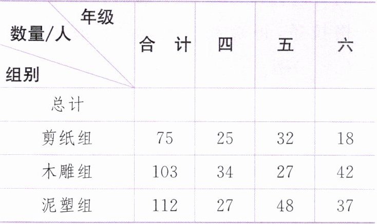 2.(五育并举)下面是三个年级参加传统手工艺品培训的学生分组情况,请你补全复式统计表。