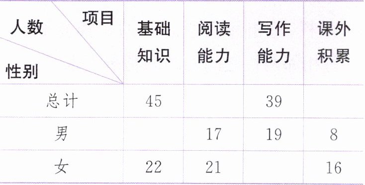 | 人数 | 项目 | 基础知识 | 阅读能力 | 写作能力 | 课外积累 |